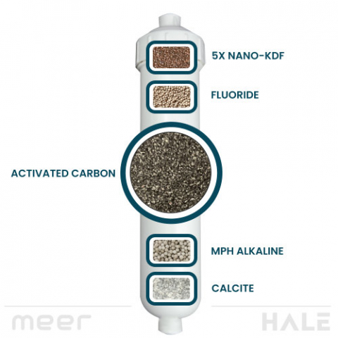 Our carbon and KDF blend adsorbs chloramine, chlorine, chemicals, metals, and help control bacteria filter growth for better filtration and fewer replacements than carbon-only systems